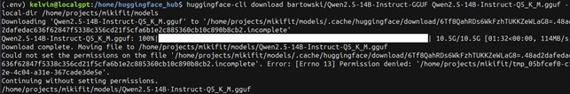 huggingface-cli download bartowski/Qwen2.5-14B-Instruct-GGUF Qwen2.5-14B-Instruct-Q5_K_M.gguf –local-dir ~/projects/mikifit/models