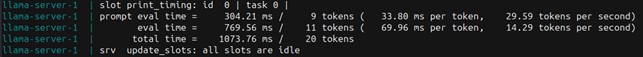 - Setup: Docker Compose, llama.cpp CUDA-image, lokaal GGUF-model